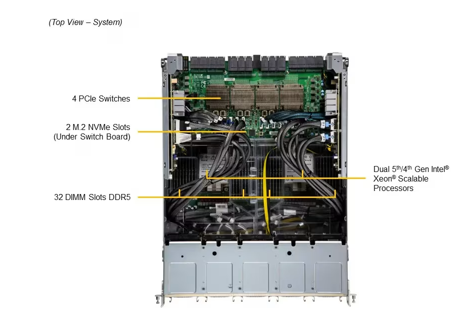 O sistema suporta dual socket Intel Xeon de 4ª ou 5ª geração, com até 64 cores e 128 threads por CPU, memória DDR5 ECC de até 8TB e 32 slots DIMM. Essa configuração permite execução simultânea de múltiplos modelos de deep learning ou simulações HPC complexas sem degradação de performance.