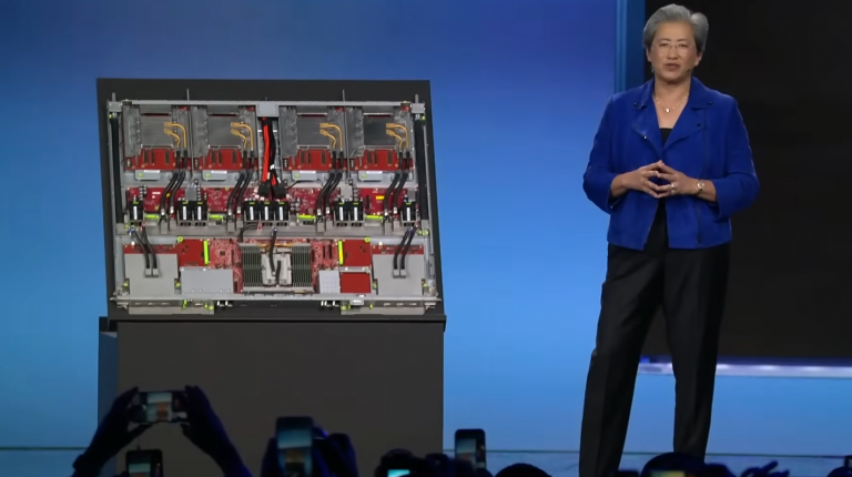 De acordo com Lisa Su, a Venice dobra a largura de banda de memória e de GPU em relação à geração anterior, garantindo que as MI455 sejam alimentadas com dados em velocidade plena, mesmo em escala de rack.