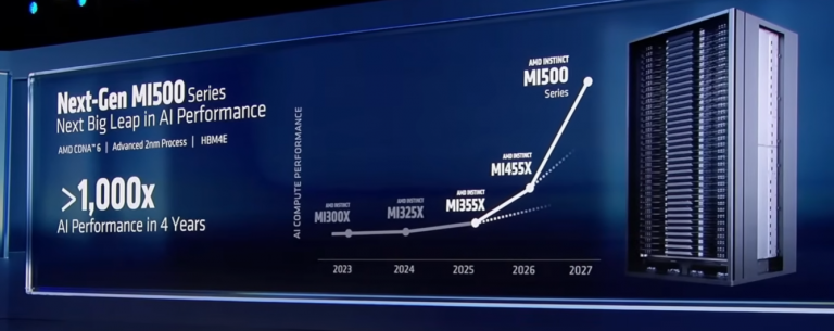 A AMD também apresentou uma prévia da futura série MI500, sucessora da MI455. As GPUs MI500 serão baseadas na arquitetura CDNA 6 e fabricadas em processo de 2 nm, incorporando memória HBM ainda mais rápida.
