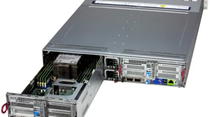 Servidor Supermicro SYS-222BT-DNR com dois nós independentes em um chassi 2U, equipado com até 24 NVMe hot-swap, suporte a CPUs Intel Xeon série 6700/6500 e…