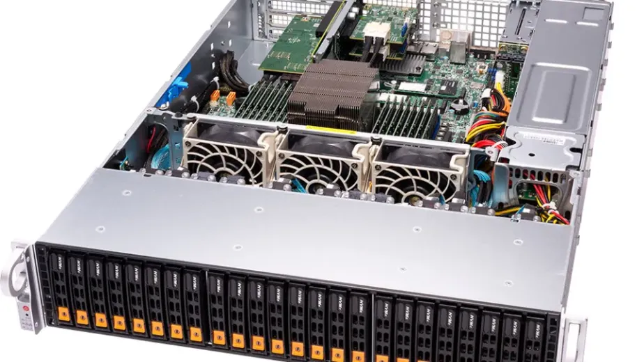 Conta com 6 baias hot-swap 2.5″ e 2 slots M.2 para unidades NVMe/SATA.