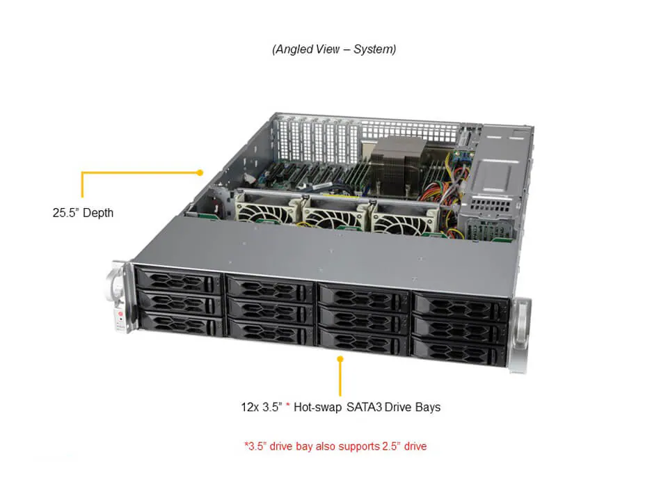 Suporta até 14 unidades SATA hot-swap, sendo 12 de 3,5″ frontais e 2 de 2,5″ traseiras (com kit opcional).