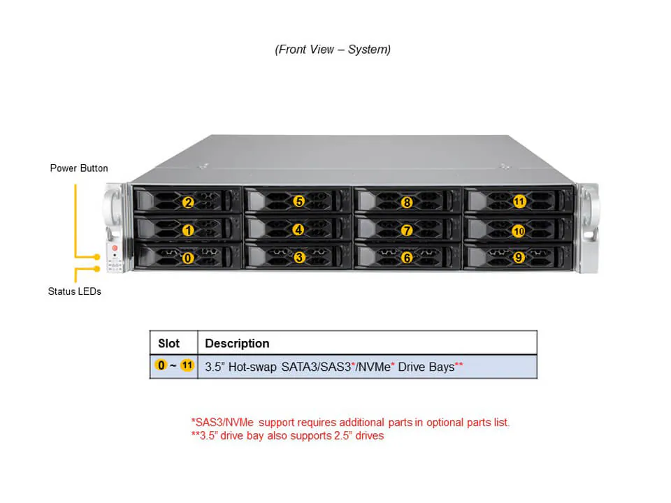 • 12 baias SATA de 3,5″ hot-swap (frontal)