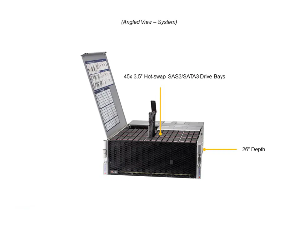 Com 45 baias de 3,5” e suporte a discos de alta capacidade, o servidor pode ultrapassar 900 TB de armazenamento bruto.