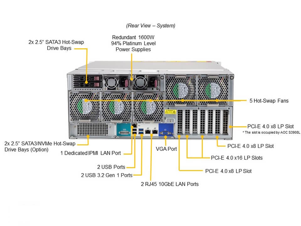 Este modelo é focado em armazenamento; para uso com GPUs, considere a linha GPU SuperServer da Supermicro.