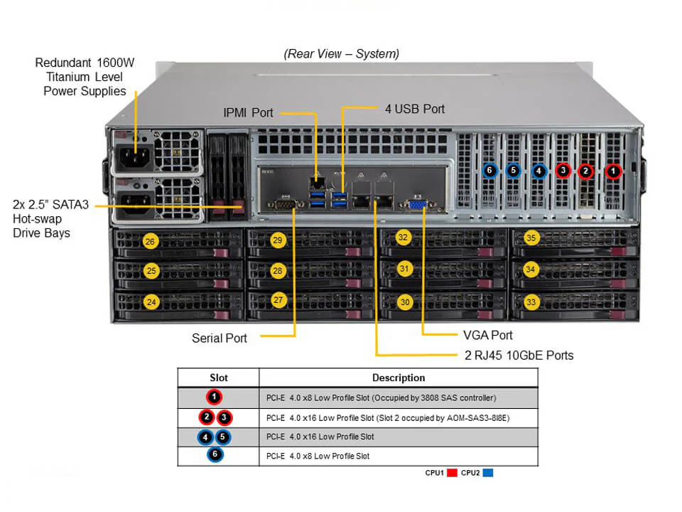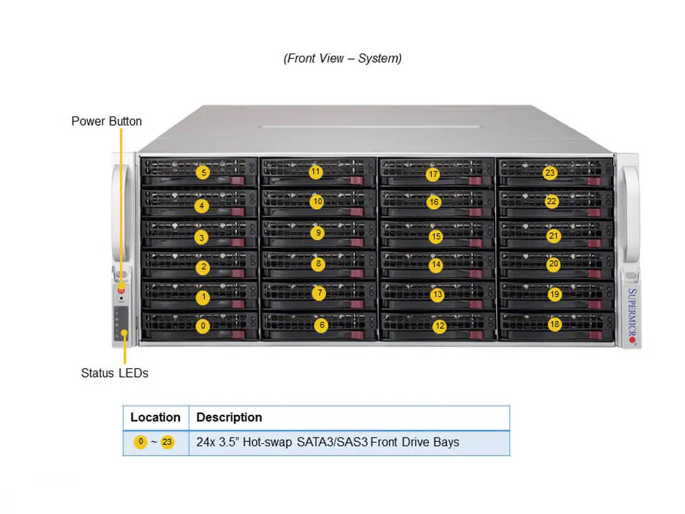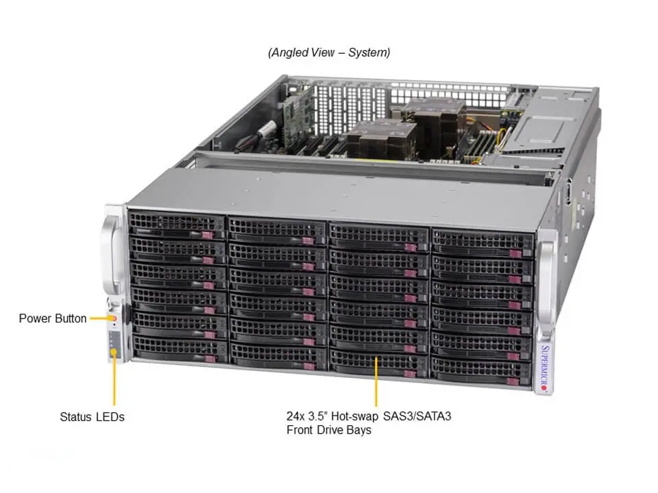 36 baias hot-swap SAS3/SATA3 (24 frontais, 12 traseiras)