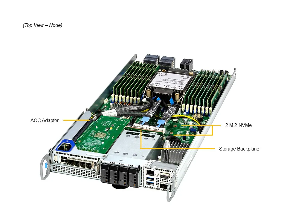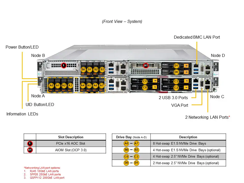 São suportadas até 8 unidades NVMe E1.S hot-swap por nó, com opções de configuração para 4 ou 2 unidades de 2,5″ se necessário.