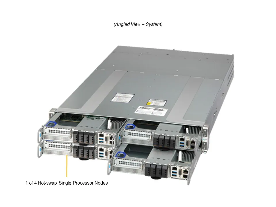 O Supermicro SYS-212GT-HNF é um servidor 2U de alta densidade com 4 nós independentes e hot-pluggable, projetado para workloads modernos que exigem desempenho, escalabilidade e eficiência térmica. Ideal para data centers, computação em nuvem, inferência de IA de ponta e aplicações de borda, esse servidor combina a potência dos processadores Intel® Xeon® série 6700 com o armazenamento de alta velocidade NVMe E1.S.