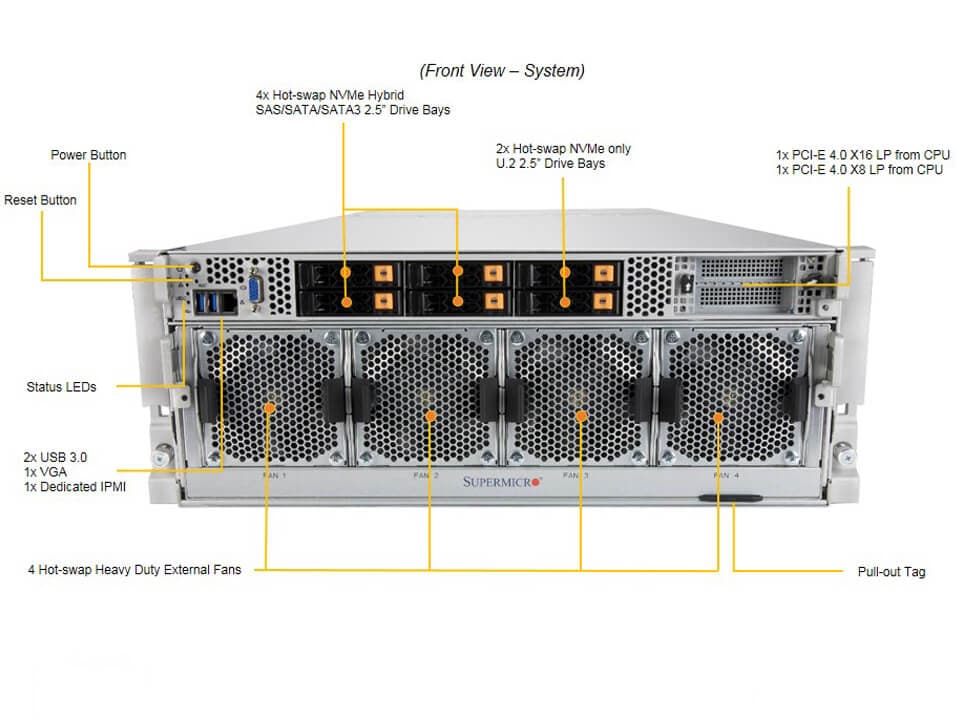 O Supermicro A+ Server AS-4124GO-NART é um servidor de alto desempenho projetado para cargas de trabalho intensivas como inteligência artificial (IA), aprendizado profundo e computação de alto desempenho (HPC). Com suporte a até 8 GPUs NVIDIA HGX A100 com interconexão NVLink e NVSwitch, e processadores AMD EPYC série 7003/7002, este sistema oferece uma solução poderosa e escalável para os desafios mais exigentes em centros de dados modernos.