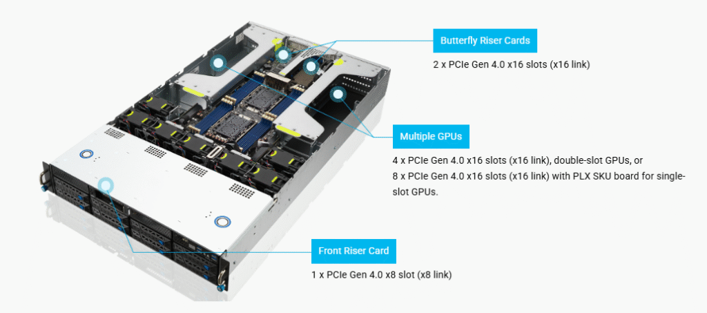 O chassi 2U foi projetado para otimizar a densidade computacional sem comprometer a refrigeração, permitindo acomodar até quatro GPUs de slot duplo ou oito GPUs de slot simples, conforme o SKU. Essa flexibilidade torna o sistema ideal tanto para inferência e treinamento de IA quanto para workloads de simulação e visualização 3D.
