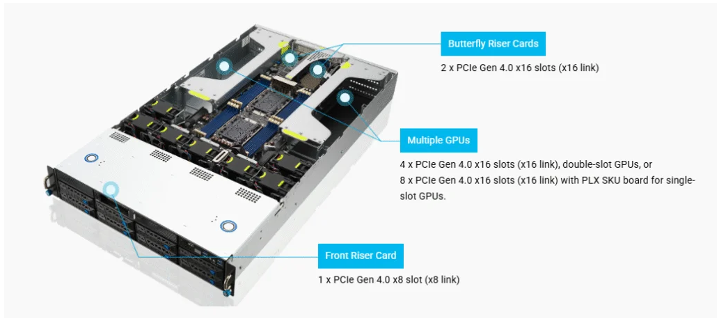 O chassi 2U foi projetado para otimizar a densidade computacional sem comprometer a refrigeração, permitindo acomodar até quatro GPUs de slot duplo ou oito GPUs de slot simples, conforme o SKU. Essa flexibilidade torna o sistema ideal tanto para inferência e treinamento de IA quanto para workloads de simulação e visualização 3D.