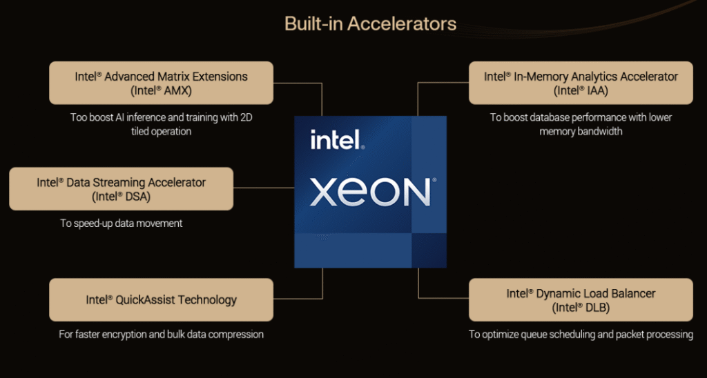 Com 16 slots de memória DDR5 — oito por CPU — o sistema pode atingir até 4 TB de RAM por soquete, além de compatibilidade com módulos Intel Optane Persistent Memory 300 Series. Essa configuração permite que grandes conjuntos de dados permaneçam em memória, acelerando significativamente operações de inferência e análise em tempo real.