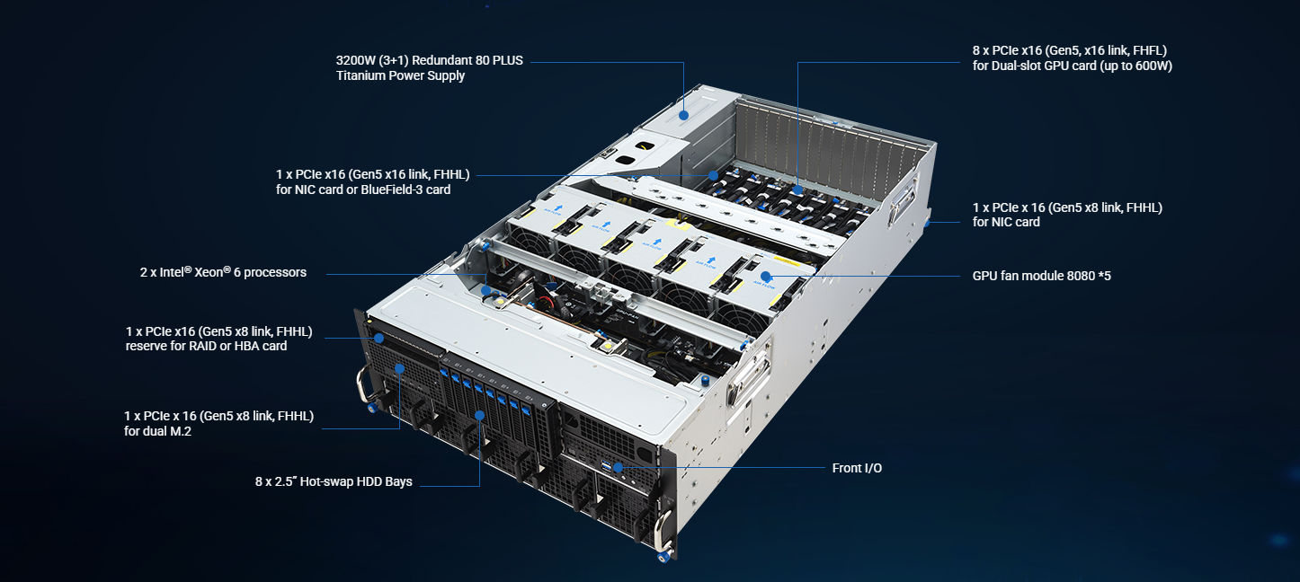 Com suporte a até 32 slots DIMM DDR5 (8 canais por CPU), o sistema atinge até 4TB de memória, operando em frequências de até 6400MHz (1DPC). Essa arquitetura de memória de alta largura de banda garante que as GPUs possam operar em máxima eficiência, eliminando gargalos entre CPU e memória principal.