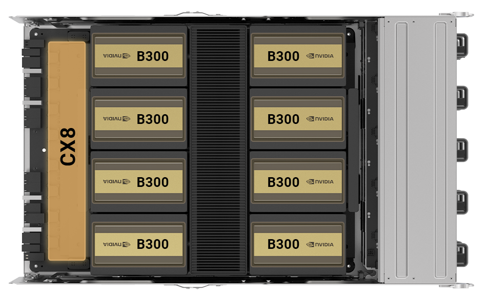 O elemento distintivo é a integração de 8 portas InfiniBand CX8 diretamente em cada GPU, com suporte a até 800G/s por SXM. Essa integração reduz drasticamente a dependência de NICs adicionais e simplifica a topologia de rede interna, reduzindo latência, cabos e consumo energético. É uma mudança estrutural que redefine como clusters de IA são conectados e escalados.