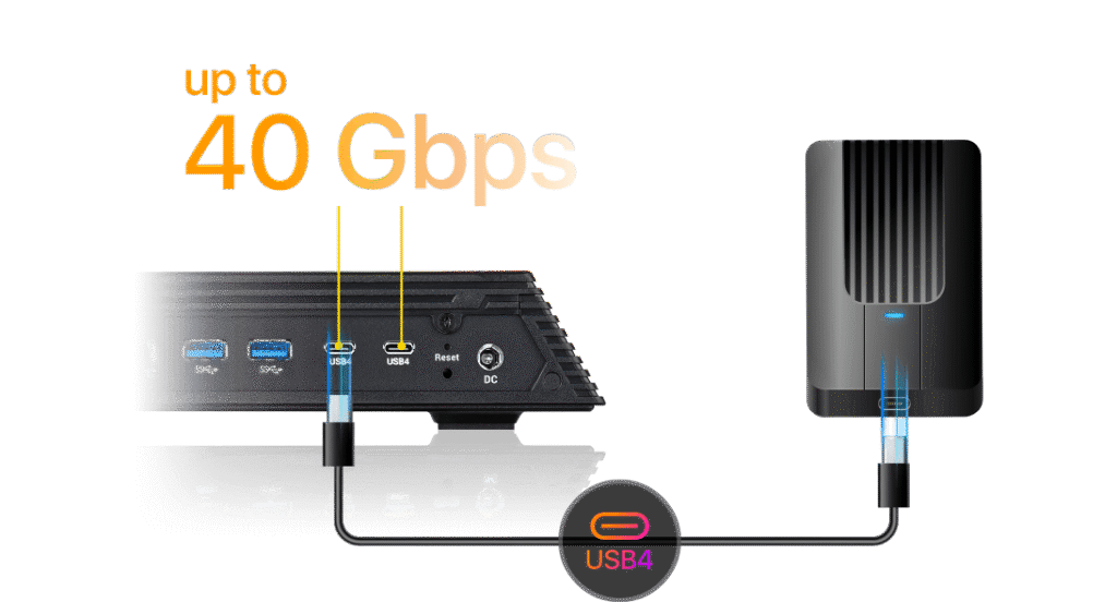 São duas portas USB4 (Tipo C) com até 40 Gbps para dispositivos de armazenamento USB4, Thunderbolt 3 ou Thunderbolt 4, além de três USB 3.2 Gen 2 (Tipo A). Observação importante: as CPUs Ryzen Embedded V3000 não suportam conexão direta host-a-host USB4 para rede; portanto, as portas USB4 do dispositivo não se conectam diretamente a computadores ou Macs por USB4/Thunderbolt.