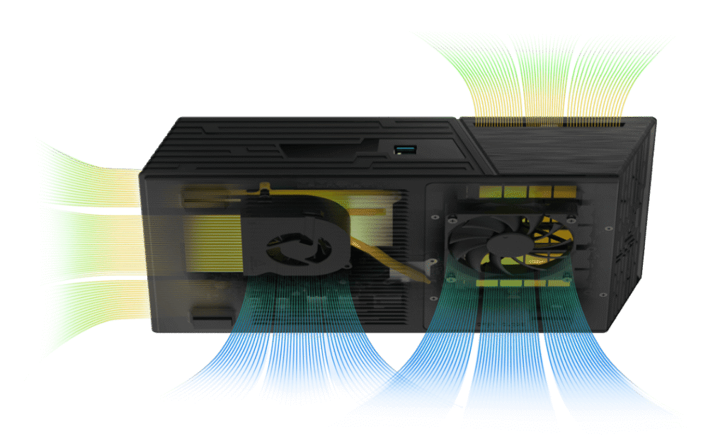 O design térmico aprimorado inclui ventoinhas estrategicamente posicionadas, eficientes e silenciosas, resfriando componentes de alto desempenho e mantendo níveis de ruído baixos, de forma a sustentar performance sob carga.