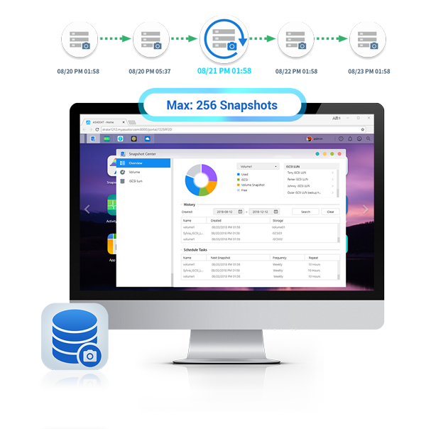 O Snapshot Center permite até 256 snapshots por volume, com intervalos de até cinco minutos. Em ambientes suscetíveis a modificações constantes — como bibliotecas de projetos ou diretórios críticos — snapshots frequentes reduzem a janela de exposição a falhas humanas ou ataques.