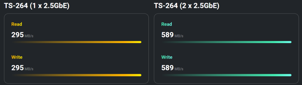 O QNAP TS-264 foi projetado para superar exatamente esses gargalos. Seu primeiro diferencial está na conectividade: com duas portas 2,5GbE, oferece até 589 MB/s em modo Port Trunking, rivalizando com soluções de 10GbE de entrada, mas a um custo mais acessível.