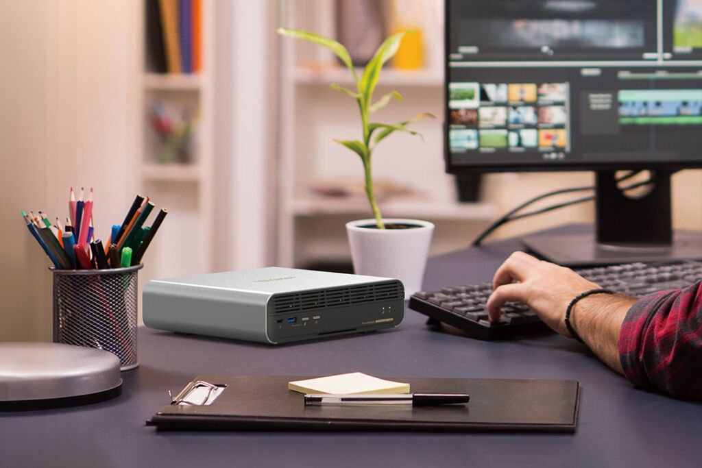 Diferente de um DAS, o NASbook centraliza e viabiliza colaboração simultânea. Com Thunderbolt™ 4 e 10GbE/2,5GbE, a equipa edita diretamente a partir do TBS-h574TX, evitando esperas por cópias entre unidades e computadores. Ao finalizar um projeto, os ficheiros podem ser arquivados num DAS USB (como o TR-004), libertando espaço para o próximo trabalho.