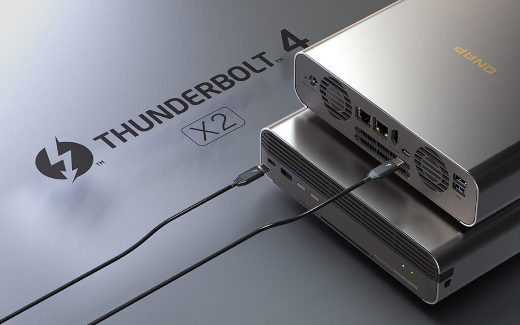 Com duas portas Thunderbolt™ 4, estações Mac® (incluindo modelos com chip M1 e M2) e Windows® podem conectar-se diretamente ao TBS-h574TX. A largura de banda atinge até 20 Gb/s, suficiente para edição de vídeo 4K em tempo real e transferências rápidas — por exemplo, um vídeo 4K de 1 TB pode ser transferido em ~11 minutos.
