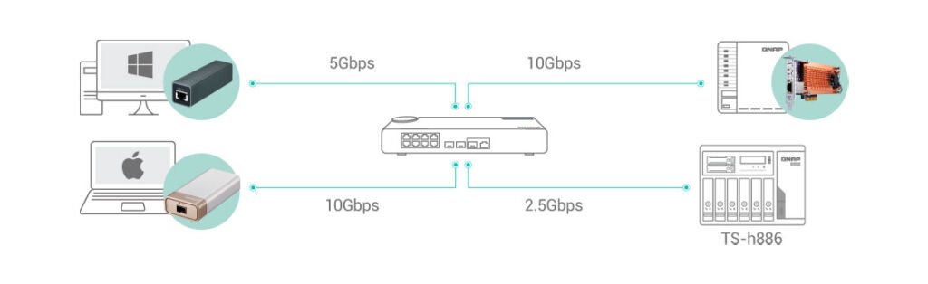 As quatro portas LAN de 2,5GbE garantem transferência em alta velocidade mesmo com infraestrutura de rede existente (cabos CAT5e). O entroncamento de porta (port trunking) e o failover proporcionam balanceamento de carga e alta disponibilidade, essenciais para continuidade operacional.