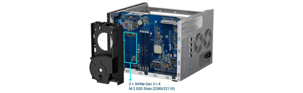 Com 2 slots M.2 NVMe Gen3 e 2 baias de SSD de 2,5”, o TS-h886 permite a construção de um cache de leitura e gravação de altíssimo desempenho, ideal para cargas de trabalho com alto IOPS, como bancos de dados e VMs. Como os slots M.2 não ocupam baias de 3,5”, o desempenho é elevado sem sacrificar capacidade bruta.
