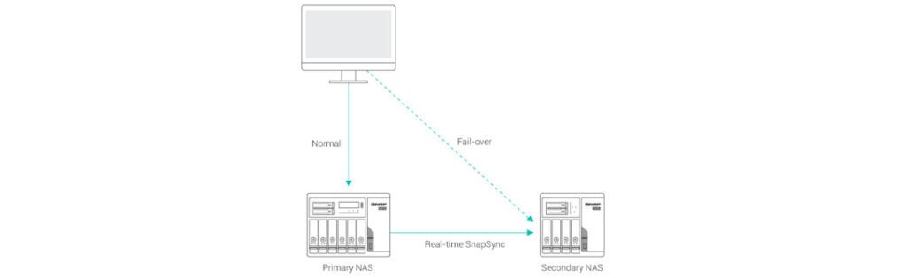O SnapSync oferece replicação síncrona entre NAS primário e secundário. Assim que um arquivo é gravado no sistema principal, ele é imediatamente copiado para o destino. Em caso de falha, o NAS secundário pode assumir a operação com mínimas alterações, assegurando continuidade de negócio e alta disponibilidade dos dados.