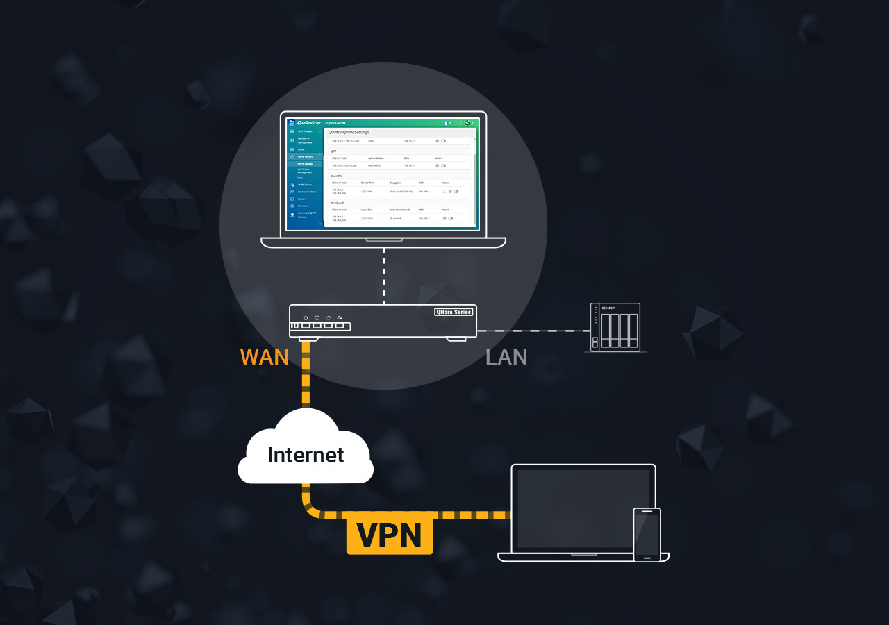 Ao adicionar o QHora-322 ao QuWAN Orchestrator, o sistema configura rotas e túneis VPN de forma centralizada. Isso viabiliza uma arquitetura multilocal consistente, onde sede, filiais e até NAS remotos comunicam-se como se estivessem na mesma rede lógica.