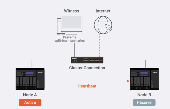Para ambientes críticos, a configuração de clusters de Alta Disponibilidade (HA) com dois TVS-h474 garante continuidade operacional. O servidor passivo assume o controle em menos de 60 segundos em caso de falha do servidor ativo, minimizando o RTO e garantindo sincronização de dados em tempo real (RPO mínimo).