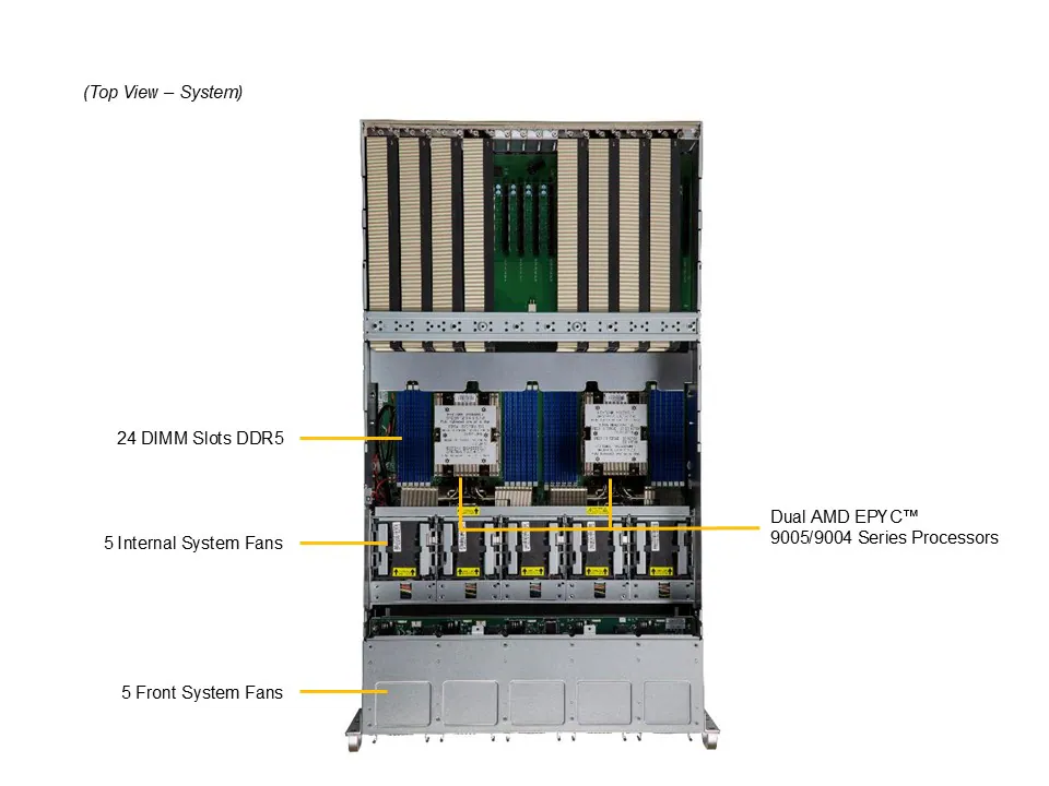 O Supermicro AS-5126GS-TNRT combina dois processadores AMD EPYC™ 9005 Series com até 192 cores físicas e 384 threads, oferecendo poder de processamento massivo para suportar simultaneamente 8 GPUs de alta performance, incluindo NVIDIA H100 NVL, H200 NVL (141GB), RTX PRO 6000 Blackwell Server Edition e L40S. A memória DDR5 ECC RDIMM, com até 6TB em 24 slots, garante integridade de dados e largura de banda suficiente para cargas de IA intensivas.