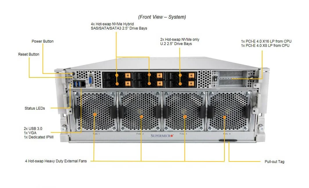 O sistema oferece 6 baías hot-swap de 2,5″ NVMe, com opção de expansão para 10 drives via 4 baías traseiras adicionais. A integração de PCIe 4.0 x16 e x8 via switch e CPUs assegura compatibilidade com controladores de alta velocidade e placas de expansão (AIOM), permitindo configurar ambientes de armazenamento flash de altíssima performance para dados temporários e modelos em treinamento.