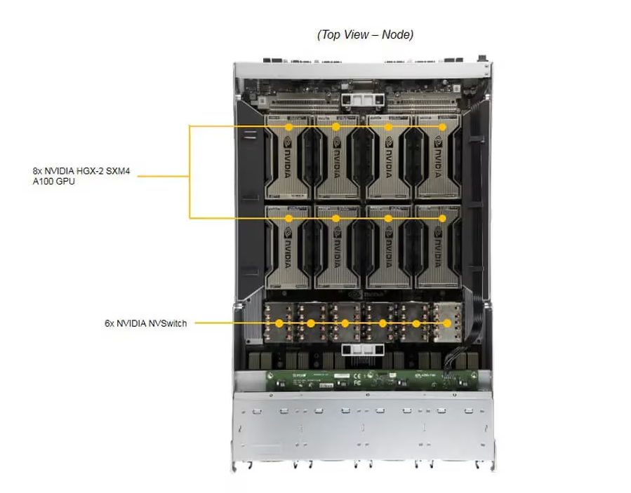 O 4U GPU Server Supermicro integra até 8 GPUs NVIDIA HGX A100, com 40GB (HBM2) ou 80GB (HBM2e) por GPU, oferecendo largura de banda de memória massiva para cargas intensivas. A arquitetura NVLINK v3.0, combinada com NVSwitch, garante comunicação ponto a ponto entre GPUs com latência mínima, eliminando gargalos típicos de interconexão PCIe padrão.