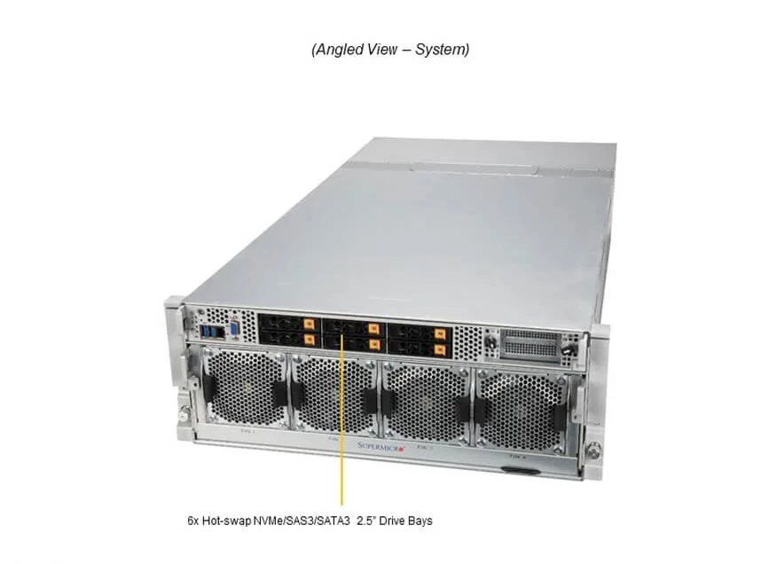 O sistema também inclui 6 baias hot-swap de 2.5″ para NVMe/SATA/SAS e 2 slots M.2 para boot, oferecendo flexibilidade para armazenamentos de alto desempenho e redundância crítica para operação contínua.