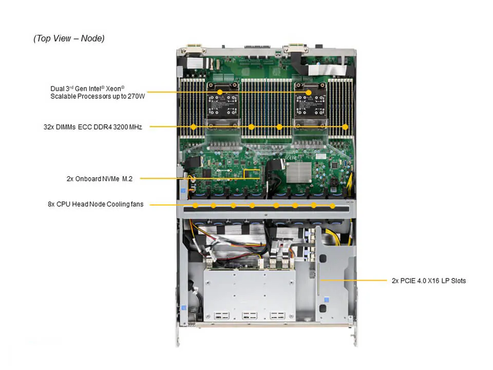 O SYS-420GP-TNAR+ utiliza processadores Dual Socket P+ Intel® Xeon® de 3ª geração, suportando até 40 núcleos por CPU e 8TB de memória DDR4 ECC com suporte a Optane Persistent Memory. Essa configuração garante capacidade de processamento massiva, tolerância a falhas em memória e baixa latência na transferência de dados.