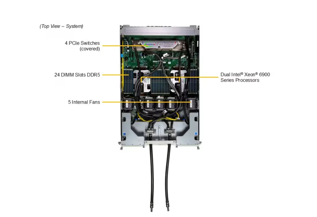 Com suporte a duas CPUs Intel Xeon 6900 — até 128 núcleos e 504 MB de cache por processador — e oito GPUs NVIDIA HGX B200 SXM com 1.4 TB de memória total, o sistema oferece uma densidade de computação que antes exigia múltiplos servidores. A interconexão entre GPUs via NVLink e NVSwitch elimina gargalos de comunicação interna, permitindo que os modelos de IA e HPC operem em escalas massivas de dados.