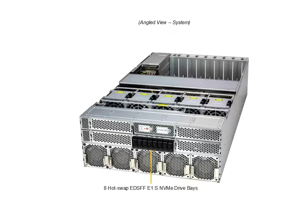 Workloads intensivos em dados exigem memória de alta capacidade e consistência de erros (ECC) para prevenir falhas críticas. Este servidor suporta até 24 DIMMs DDR5 ECC de até 6400 MT/s (ou 8800 MT/s MRDIMM), totalizando até 6TB por CPU, além de até 8 NVMe E1.S hot-swap de alta velocidade, permitindo armazenamento rápido para datasets massivos.