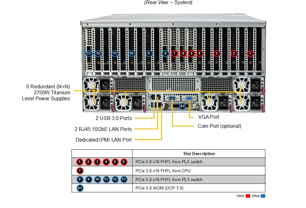 A arquitetura Dual-Root PCIe permite que até 10 GPUs PCIe de diferentes tamanhos (single, double, triple ou quad-width) operem com máxima largura de banda, evitando contenção de I/O. Cada root complex gerencia um conjunto de GPUs, garantindo paralelismo eficiente e alta escalabilidade.