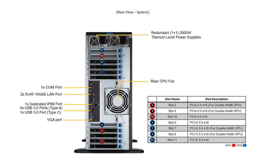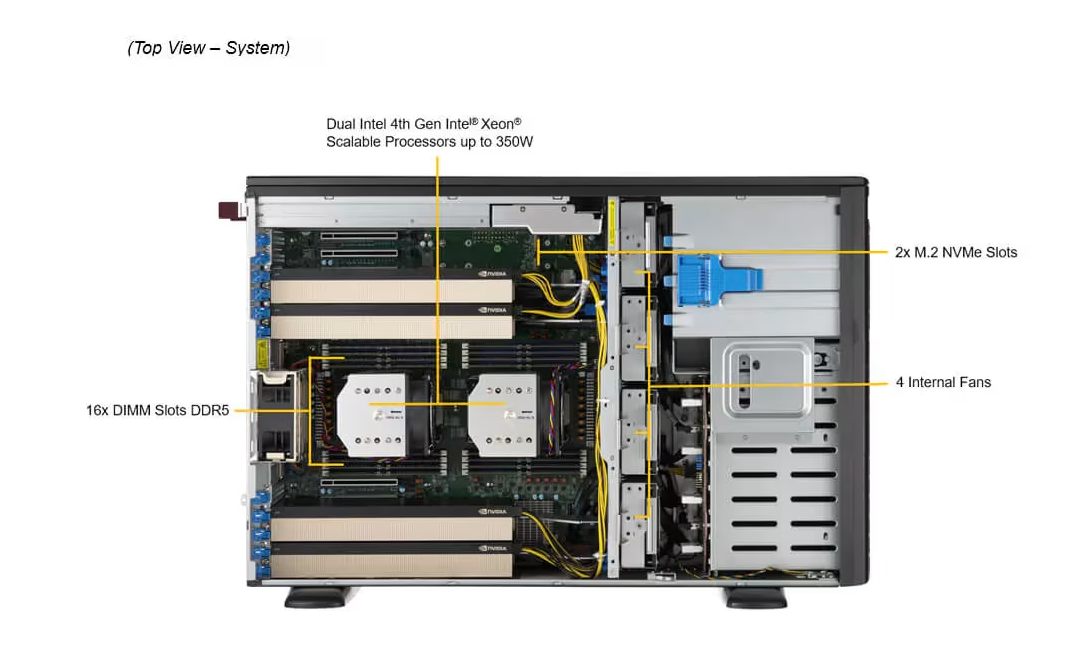 O Supermicro SYS-741GE-TNRT representa uma solução de ponta em servidores torre equipados com GPUs, projetado para atender às demandas mais críticas de High Performance Computing (HPC), Inteligência Artificial (IA) e cargas de trabalho de mídia avançada. Com suporte a processadores Intel Xeon de 4ª e 5ª geração, até 4 GPUs NVIDIA H100 ou A100 PCIe e até 4TB de memória ECC DDR5, este servidor combina capacidade de processamento extremo com flexibilidade de expansão, posicionando-se como um ativo estratégico para organizações que buscam desempenho sem compromissos.
