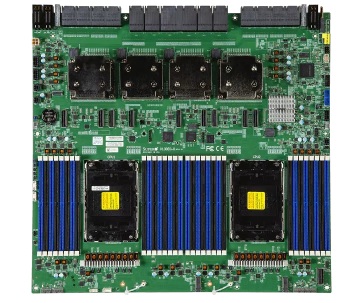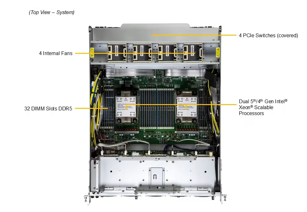 - Duas CPUs Intel Xeon Scalable de 5ª/4ª geração (até 64 núcleos e 320 MB de cache por CPU), conectadas em topologia PCIe 5.0 x16.