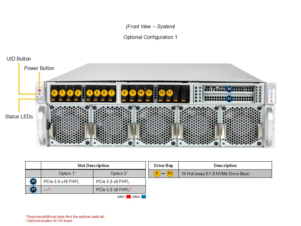 O sistema suporta até 14 drives E1.S NVMe hot-swap, proporcionando throughput massivo e latência reduzida, ideal para workloads de IA e HPC que exigem acesso simultâneo a grandes datasets. Alternativamente, suportes de 2/4/6 unidades 2.5″ NVMe permitem customização segundo o perfil de performance e densidade de armazenamento.