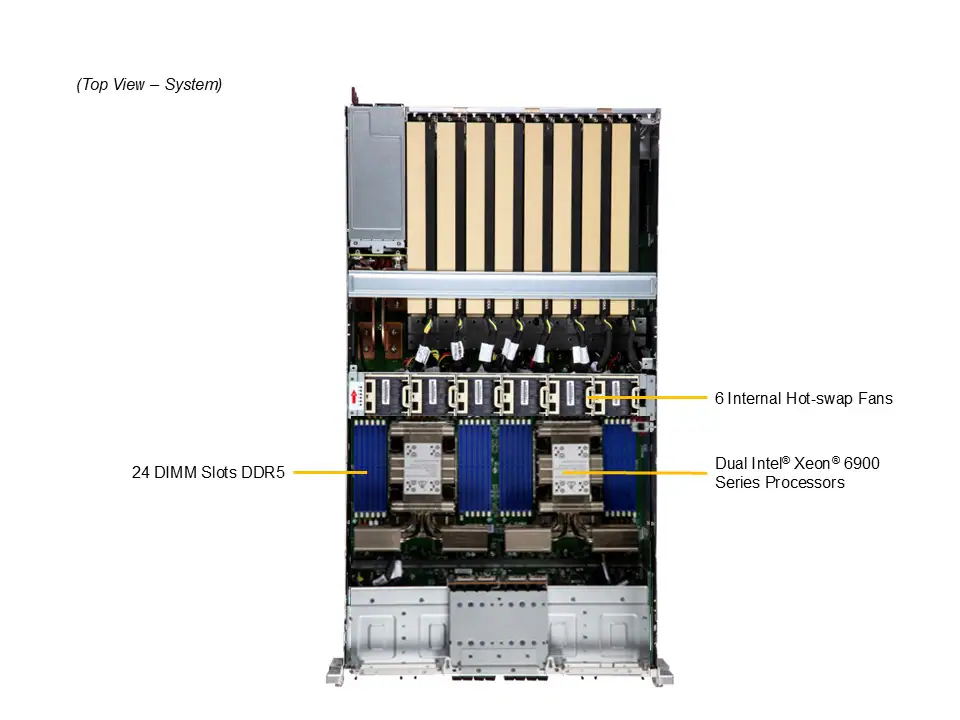 Com 24 slots DIMM, o sistema suporta até 6TB de DDR5 ECC RDIMM ou 6TB de MRDIMM a 6400MT/s e 8800MT/s, garantindo integridade de dados em ambientes de missão crítica. O uso de memória ECC é vital para prevenir corrupção de dados em operações intensivas, especialmente em modelos de IA e simulações científicas.