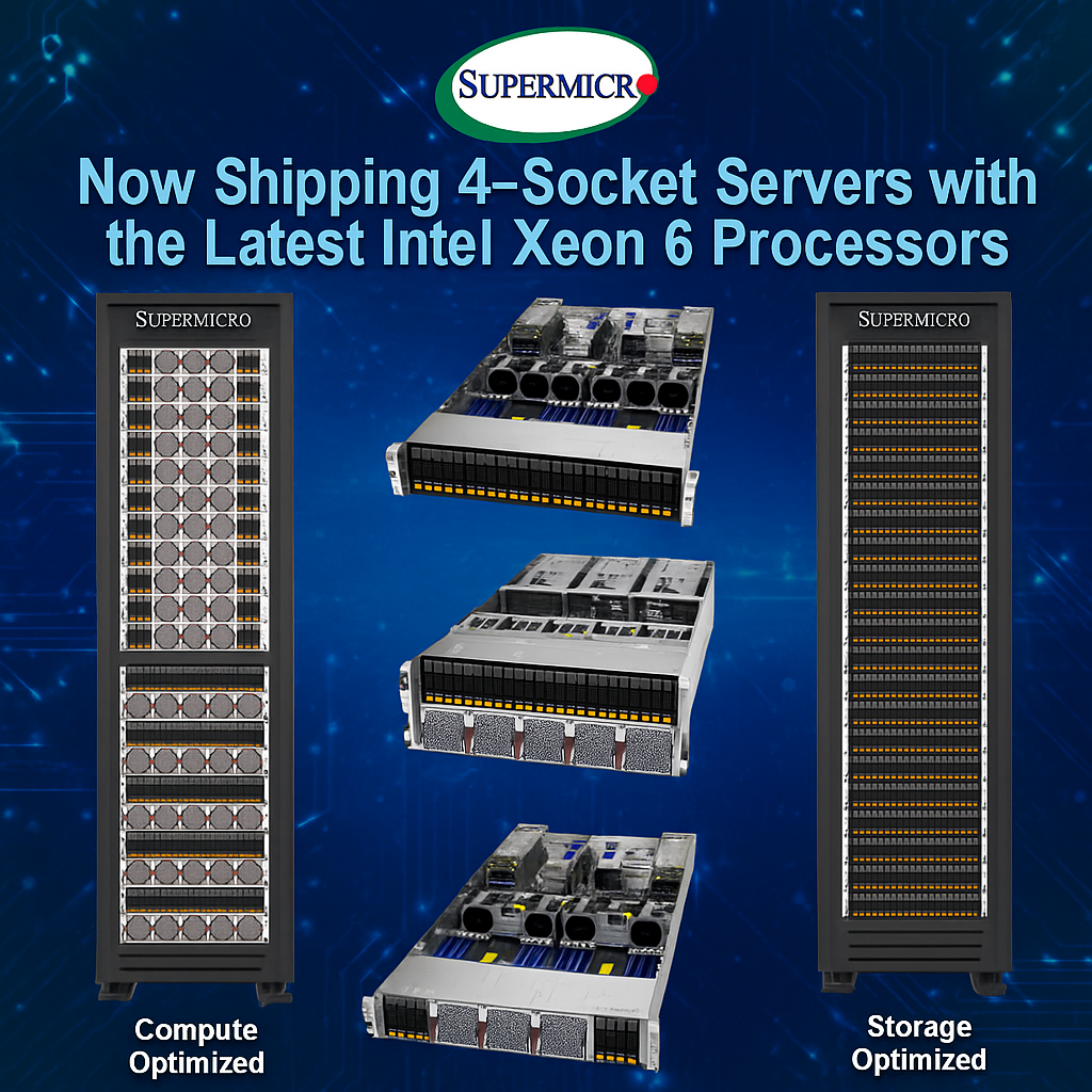 Nesse contexto, a chegada dos servidores Supermicro X14 de 4 soquetes com processadores Intel Xeon 6 representa um salto significativo. Com até 344 núcleos por sistema, suporte para 16 TB de memória e capacidade de integrar até seis GPUs de largura dupla, esses sistemas foram projetados para lidar com cargas empresariais de missão crítica, HPC, bancos de dados in-memory e fluxos de trabalho de IA de forma integrada e otimizada.