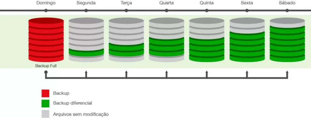 O backup diferencial representa uma solução intermediária. Ele copia todas as alterações ocorridas desde o último backup completo, acumulando diferenças a cada nova execução. Isso significa que, para restaurar os dados, basta o backup completo e o último diferencial.