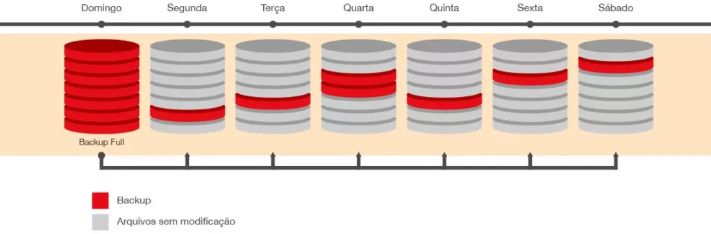 O backup incremental registra apenas as alterações feitas desde o último backup, seja ele completo ou incremental. Após uma primeira execução completa, o sistema passa a copiar apenas os dados modificados, reduzindo significativamente o tempo de backup e o espaço necessário para armazenamento.